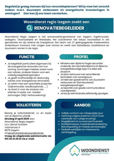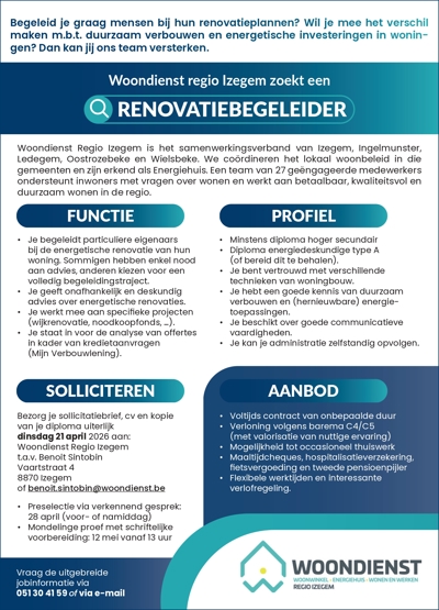 Begeleid je graag mensen bij hun renovatieplannen? Wil je mee het verschil maken m.b.t. duurzaam verbouwen en energetische investeringen in woningen? Dan kan jij ons team versterken.